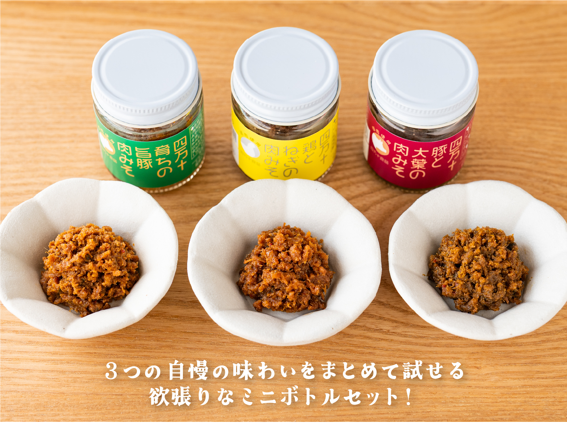 四万十のブランド肉がゴロっと入った、人気の肉みそシリーズ。3つの味わいをミニボトルに入れてセットにしました。四万十鶏の旨みと高知県産白ネギの香りが食欲をそそる「四万十鶏とねぎの肉みそ」、甘みのある四万十ポークとにんにくの香りが絶妙に調和する「四万十育ちの旨豚肉みそ」、ジューシーなポークに四万十大葉の爽やかさを加えた「四万十豚と大葉の肉みそ」の3つの個性がまとめて楽しめます。ご自宅用はもちろん、ちょっとしたギフトにもぴったりのアイテムです。