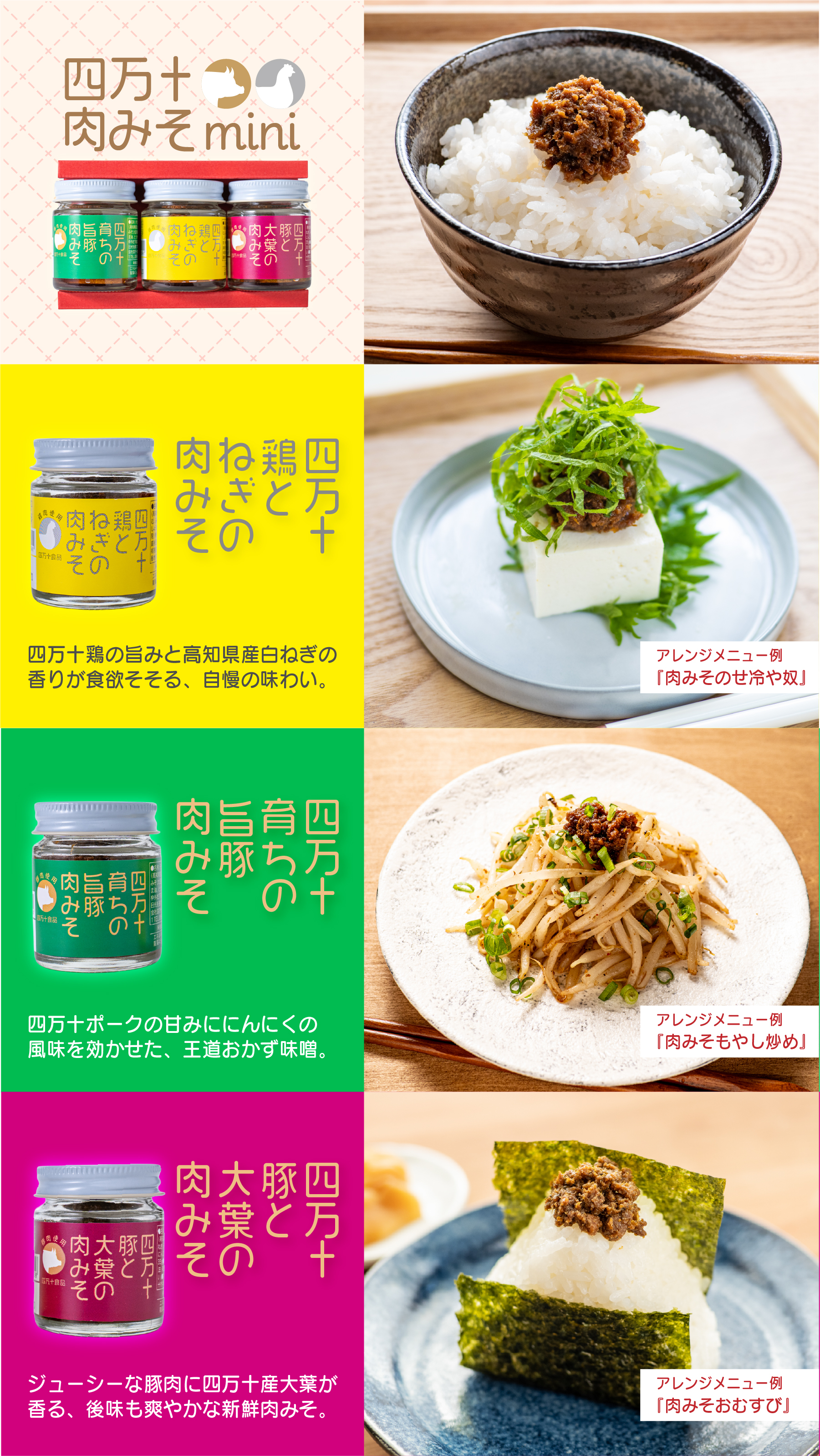 炊きたてご飯にのせれば、それだけで食欲をそそる贅沢な一品に。また、お豆腐や焼き野菜へのトッピング、おにぎりの具材、さらには麺類や炒め物の隠し味など、アイデア次第で多彩に活用いただけます。四万十ブランド肉の旨みを活かした豊かな味わいが、毎日の食卓をおいしく彩ります。